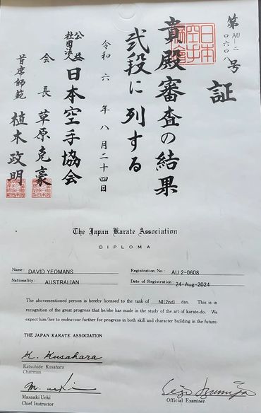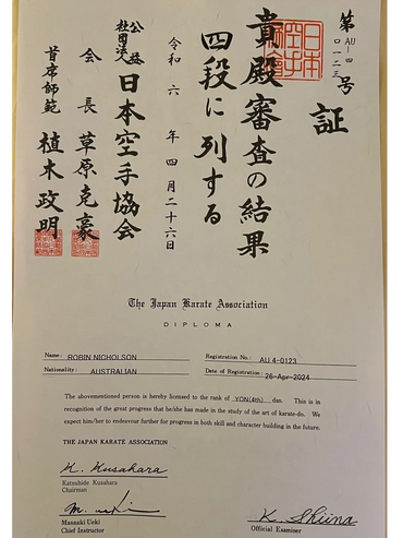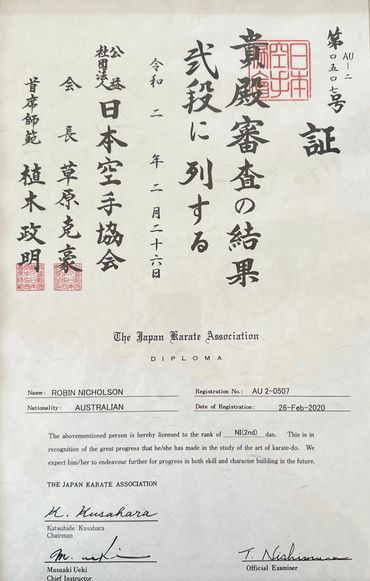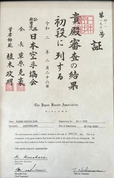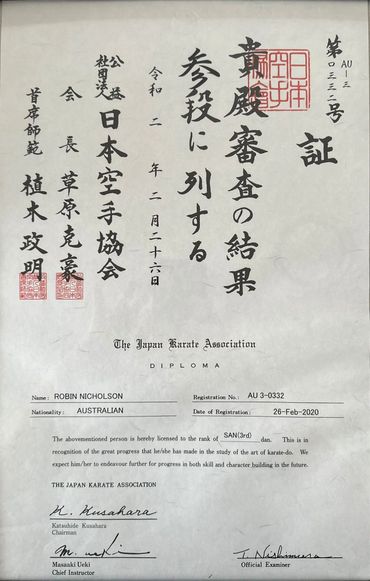 JKA Certified Instructor: Robin is a certified JKA instructor. All JKA instructors must hold at least a 2nd Dan black belt and pass written and practical tests, before they can become an Instructor. Currently, Robin holds a B-grade instructor's certification (which means he is qualified to instruct at a country level) and a C-grade judges and C- examiners rating (which means he is qualified to judge and examine at state levels) . He also possesses a first-aid certificate and is approved for working with children.