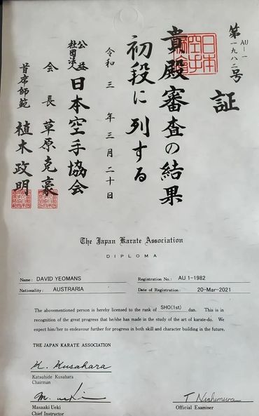 After attaining 3rd kyu (brown belt) in 2018 David was welcomed by Nishimura Shihan and was bridged into the JKAA as a 1st kyu in 2019 after 6 months of intense extra private training with Robin. Shortly after COVID-19 had closed the Dojo so Robin opened his own Dojo taking David on as his first student in JKA Castle Hill, helping him to attain both Shodan (1st Dan) through Nishimura Shihan in 2021 and Nidan (2nd Dan) through Izumiya Shihan/Ueda Sensei in 2024.